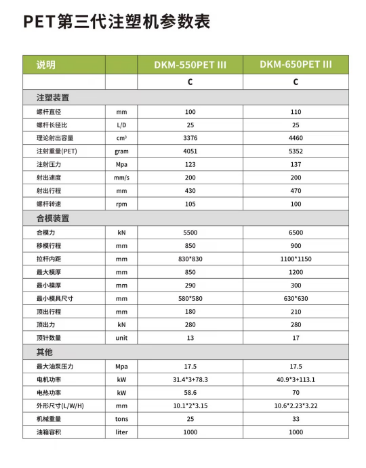 DKM-PETIII注塑机的机械部件均采用国内外一线品牌。该机具有熔胶速率高、混合速度快、注射速度快、精度高等特点。是液体包装、家居用品等行业的理想选择。